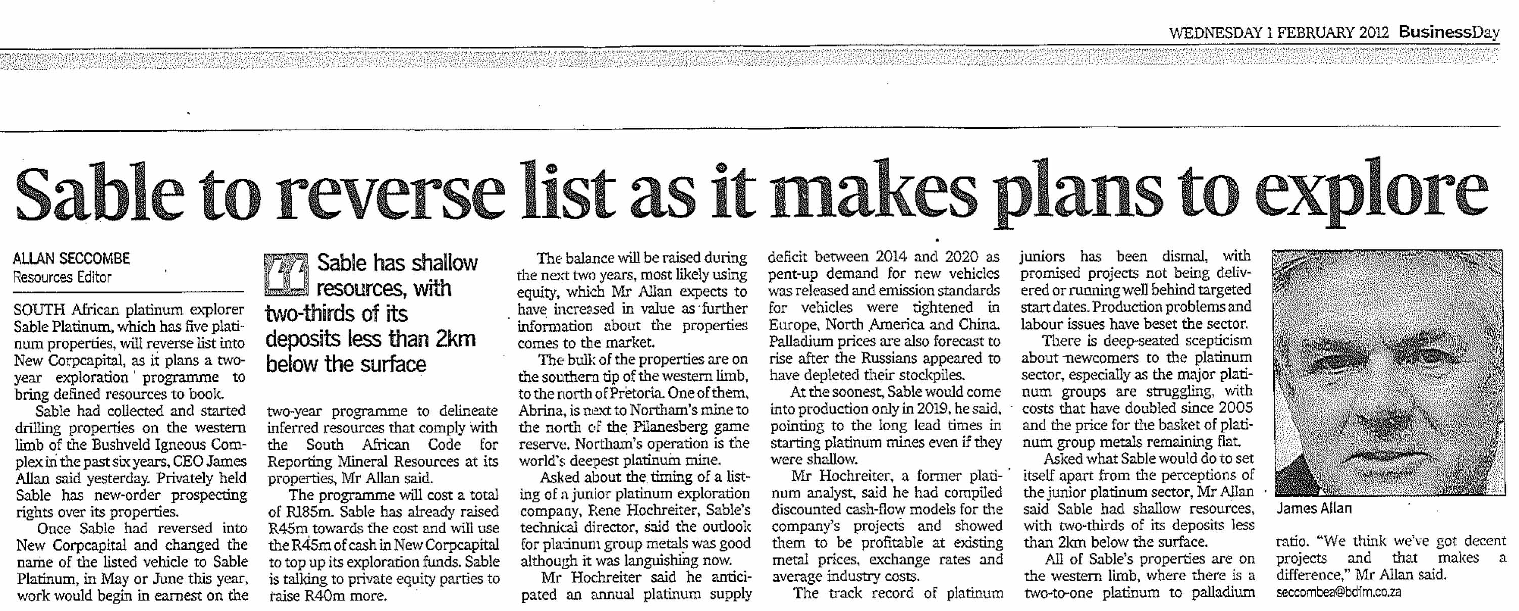 Sable Metals and Minerals Limited - Investors Article by Martin Creamer in Creamer Media's Mining Weekly.com: Article by Allan Seccombe in Business Day, BDlive: Sable Platinum Receives Cash Injection from CEO Article by Martin Creamer in Creamer Media's Mining Weekly.com: Least-mined Bushveld SA’s biggest iron-ore resource Sable Platinum Limited - Article by Alistair Anderson in Business Day, BDLive: Sable Eyes Cash Flow from New Projects Article by Mark Andrews in Silkroad (an airline magazine): Power Switch - China plans to make diesel a more attractive choice for drivers Video Link to Business Day BDlive: Sable provides outlook for platinum Article in the Financial Mail by Charlotte Mathews Article in Miningmx by David McKay New Corpcapital - Sable Platinum, Article by Wiseman Khuzwayo in Business Report, www.iol.co.za. New Corpcapital - Sable Platinum, Article in Business Day Live by Allan Seccombe: New Platinum Miner Debuts on Market. New Corpcapital - Sable Platinum, Article in MiningMx by David McKay on the Listing of Sable Platinum New Corpcapital - Sable Platinum, Article in Mining Weekly by Martin Creamer on the Listing of Sable Platinum New Corpcapital - Sable Platinum, Media Release, 23 November 2012. PSG Online: SA platinum industry – a shimmer of hope for investors; 26 July 2012 Sable Project Update: Western Bushveld South Africa; 20 July 2012 Article by Nicholas Larkin in Bloomberg, 10 July 2012: Article by David McKay in Finweek Eng - Companies & Investments, 23 February 2012: MiningMx Article: "Allan Hochreiter to list Sable Platinum", Brendan Ryan, Wed 1 Feb 2012 Business Day Article: "Sable to Reverse List as it Makes Plans to Explore" |